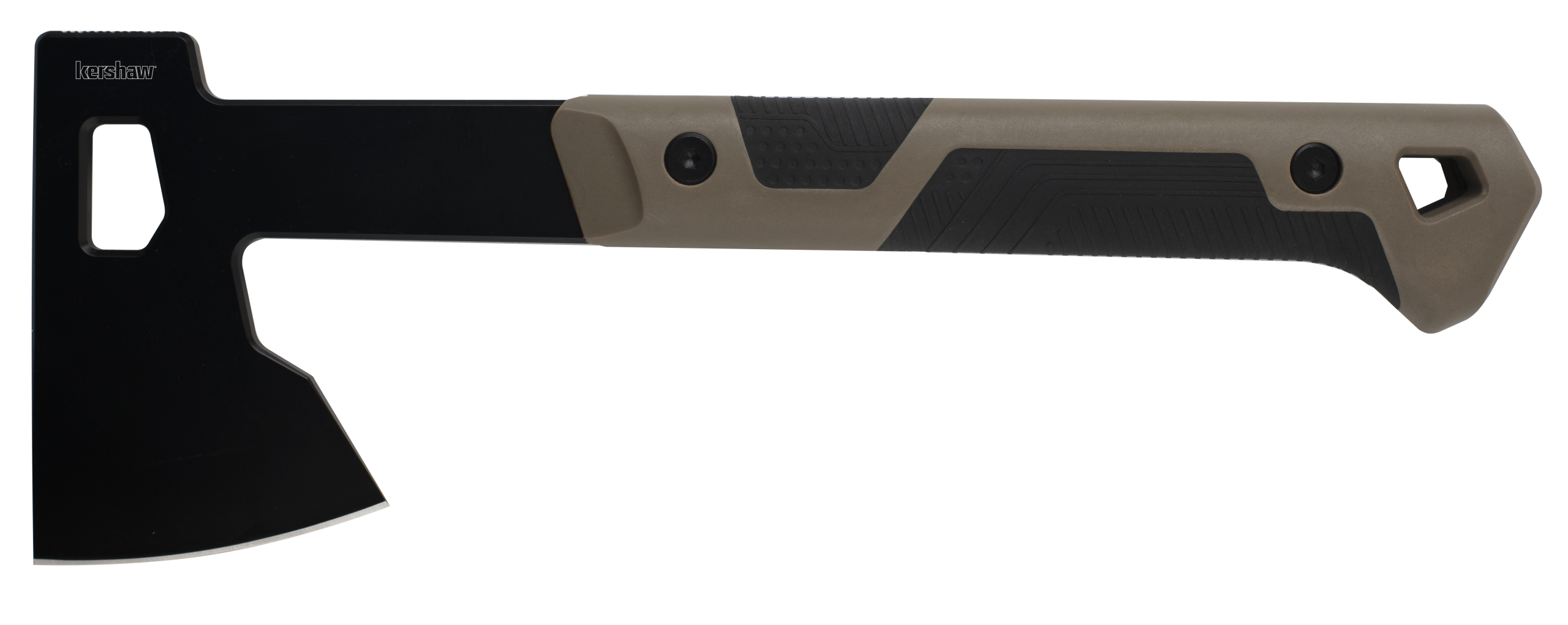 Mankind been using the ax to shape, split, and cut wood for millennia. The Kershaw Deschutes camp ax is an update on that trusty tool. With its angular handle lines and cutouts in the ax head and knob, it has a decidedly contemporary look. The cutouts also help relieve weight in this full-tang tool. The tan glass-filled nylon handle features textured rubberized inserts for secure grip. The cutout in the head is part of the included sheath and carry system. The sheath snaps into place through the hole. Once the sheath is secured, add the strap for convenient over-the-shoulder carry. Cutout in the knob provides a convenient place to add your own wrist strap.