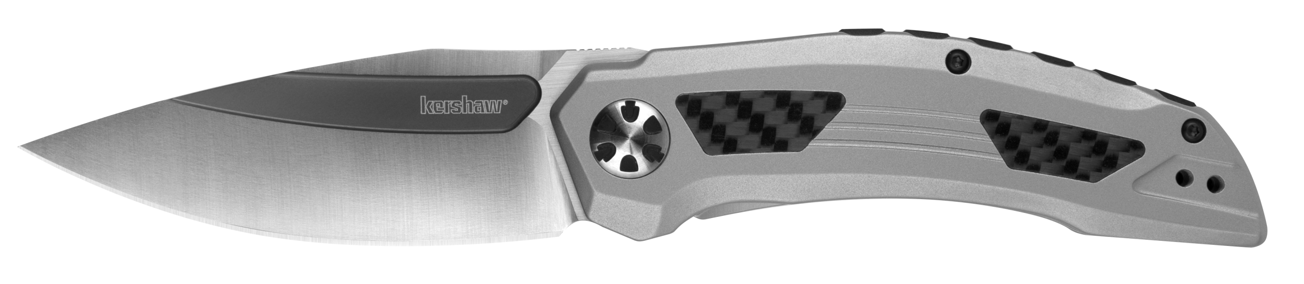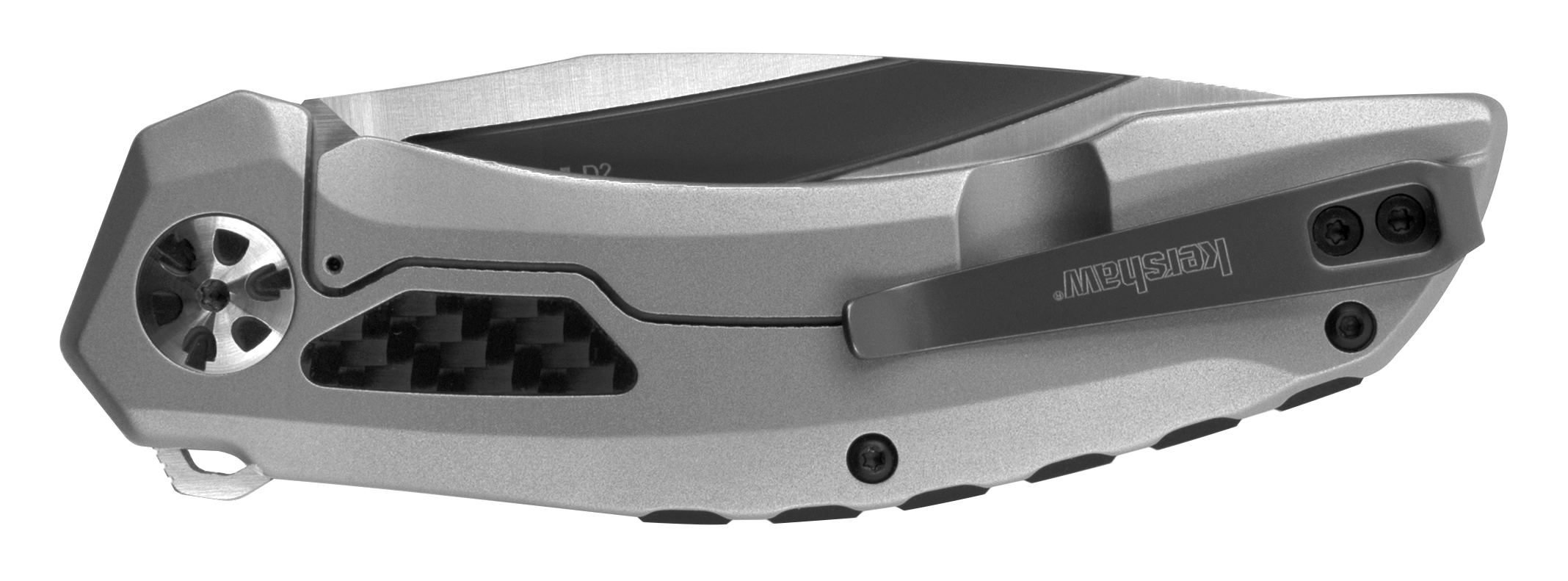 Inspired by the lines of aerospace design, the Norad has landed. The Norad opens with Kershaw’s KVT ball-bearing system and a flipper. But we reduced the size of the flipper when the knife is closed—and made it disappear altogether when the knife is open. Carbon fiber inserts in the steel handle and an oversized, polished pivot add a modern look, while a custom backspacer with raised jimping provides a secure grip. The big, beefy drop-point blade has a two-toned finish: a hollow in the blade features gray PVD coating and the rest of the blade is machine satin finished.