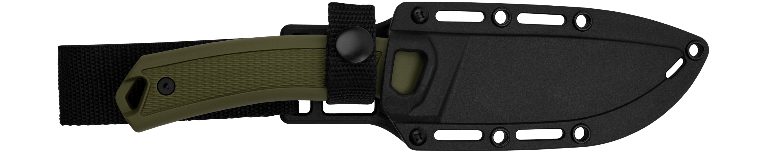 - Sheath Glass-filled nylon sheath with webbing slots, drainage hole, and removable belt strap