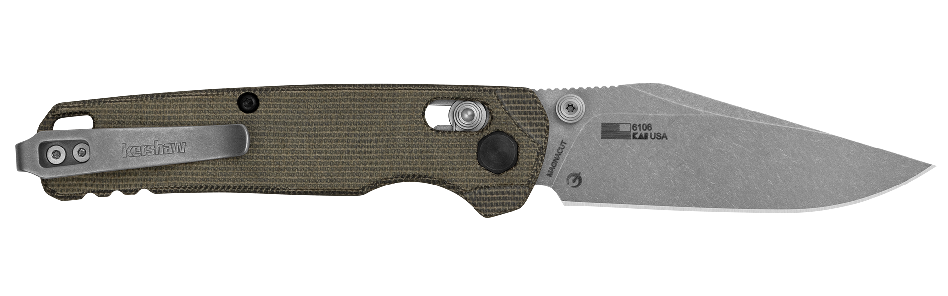 Clip point cutting action comes to the USA-made Bel Air. Access this unique blade by opening it with manual KVT ball bearings, locking it securely in place with DuraLock technology. This standout blade shape excels at piercing cuts, and MagnaCut blade steel holds an exceptional edge. Its working finish hides even more use scratches than a stonewashed finish. Control the blade using the durable canvas micarta handle in an outdoor-ready olive color. Carry the slim profile easily using the reversible deep-carry pocketclip. Stylish and sharp for everyday carry, add the Bel Air – Clip Point to your kit.
